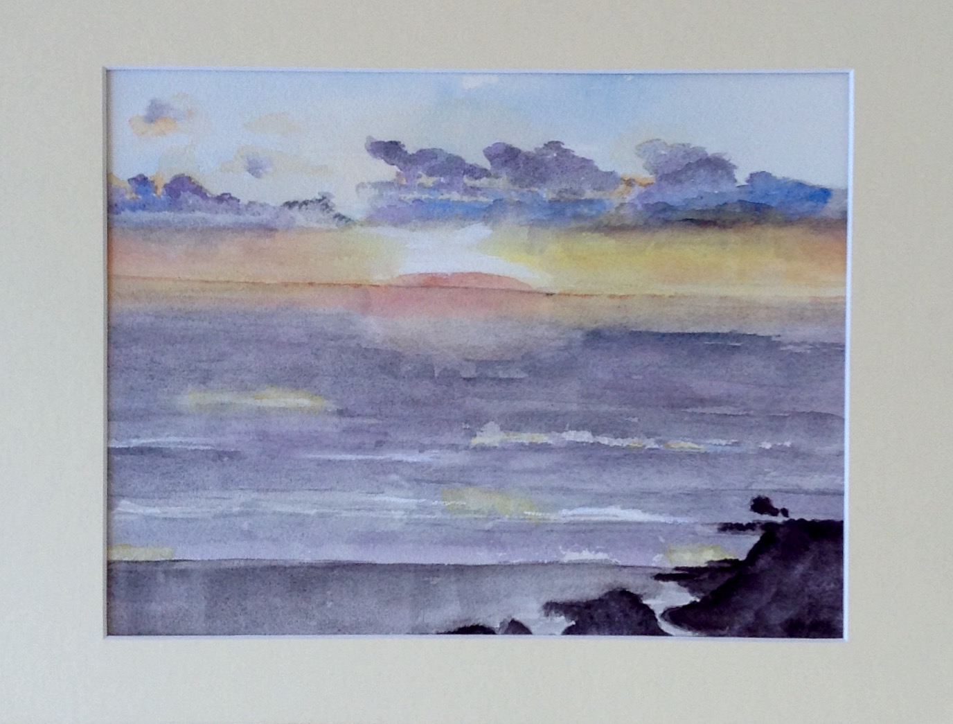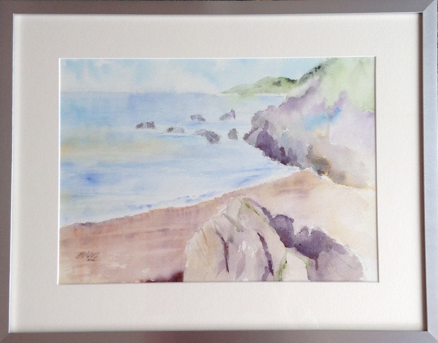 Those childhood days are now long gone but my children and grandchildren have all shared the beauty of Woolacombe and Mortehoe over the years. Even my second marriage was celebrated in the lovely Watersmeet Hotel that stands proud on the headland overlooking Combesgate beach, with Lundy Island seeming to rise from nowhere on the horizon and majestic Morte Point in the distance. Last year I had a stroke, but I’m happy to say I’ve made a good recovery, and consider myself truly blessed. After I was given the all clear from my consultant to travel, my husband brought me home to Mortehoe. At first I was very anxious about the long journey from Nottingham but I knew as soon as I breathed in that sea air and looked over to Morte Point, I’d be fine. Part of my rehabilitation was painting. It had been 15 years since I last picked up a paint brush, but I dusted off my watercolour paints and began in earnest to paint once again. I work from photographs and I’m inspired by the rugged coast of Woolacombe and Mortehoe.