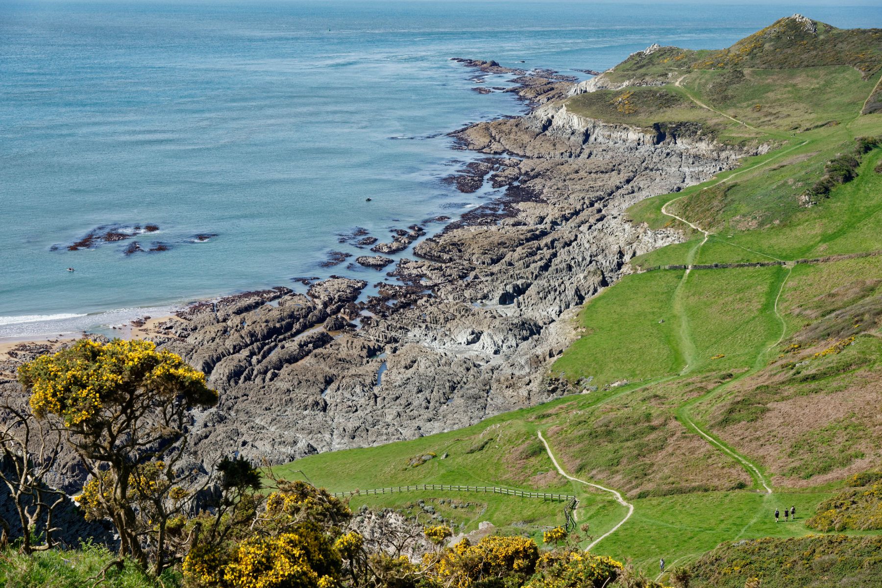 That pointed, conical elevation on our left, which conveys the impression of an ancient burrow, is Potter’s hill. Further south there lies a range of sand hills, after you have cleared that rocky point, over which, even this rest day of Father Neptune’s, the sea breaks with a fine spray that curtains the coast beyond it. These beautiful sands stretch away to Baggy Point. At Baggy Point there a precipice hundreds of feet deep, and beyond it the guns of the stranded “Weazel” maybe seen at low water. Ragged, jagged, and cruel are the rocks on our right that overlap each other until the Morte Point eclipses all in its daring challenge to the sea. A fearful, savage coast, to the terrible history of which the numerous lighthouses and lifeboats that are now thickly stationed along it are eloquent witnesses