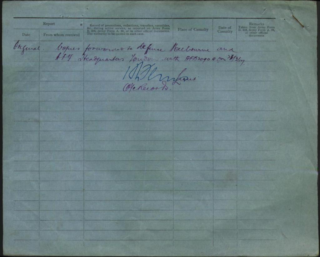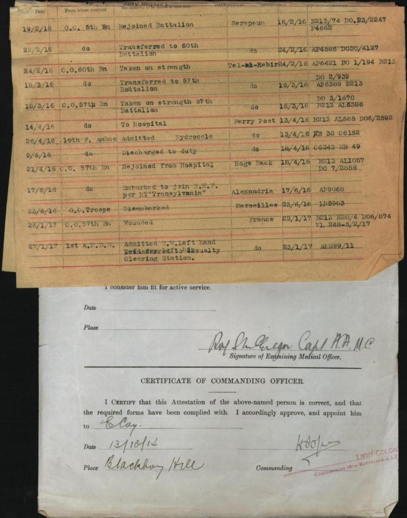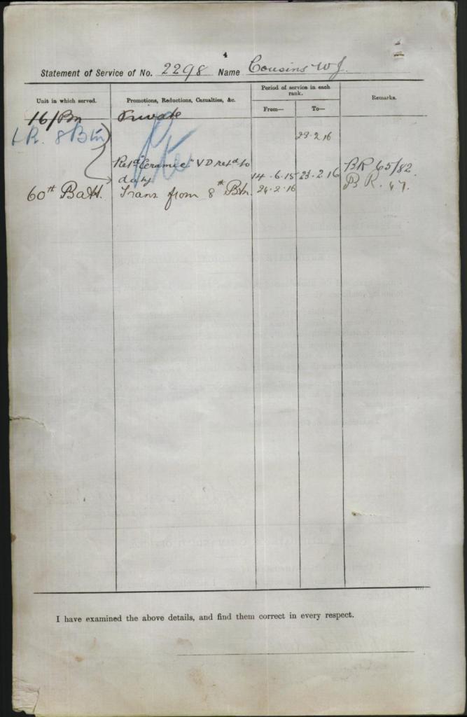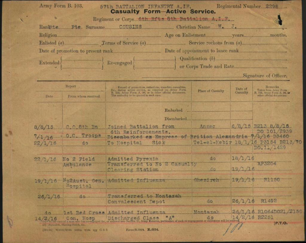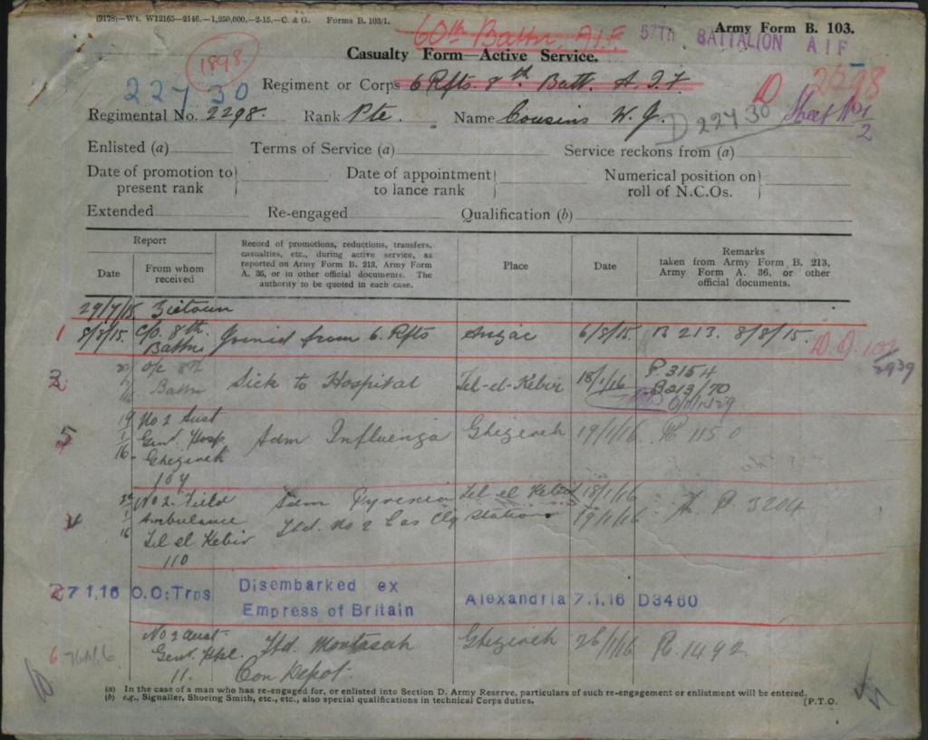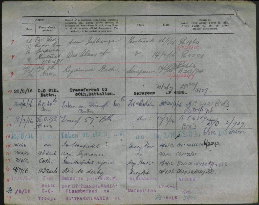 His records show that during his time in active service he would be hospitalised on the 22nd January 1916 with influenza, transferred later for convalescence and returning to service later he was again admitted to hospital for a further injury on the 14th April of the same year, this time taking six days to recover before returning to the battlefield on the 21st April 1916.