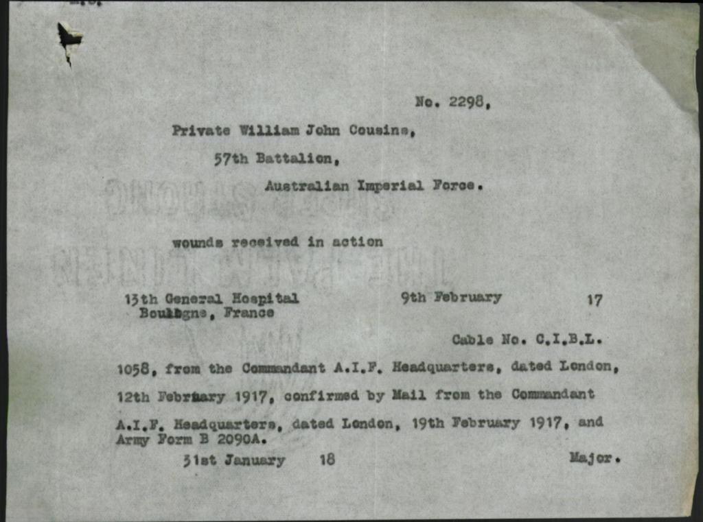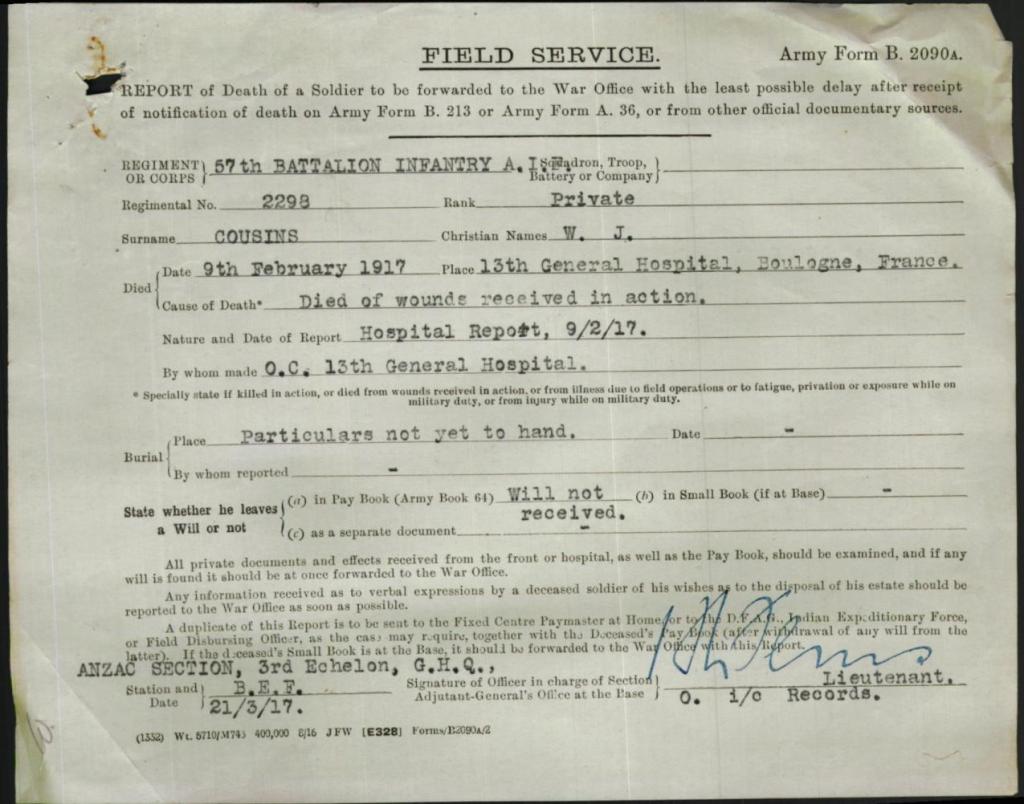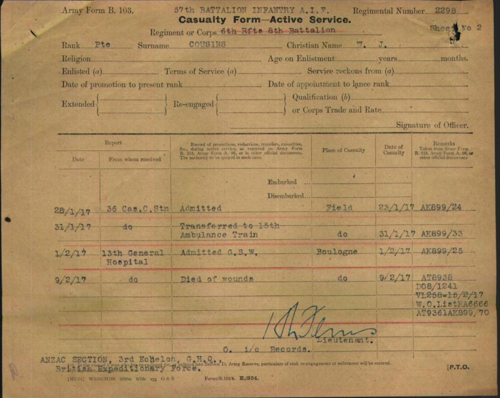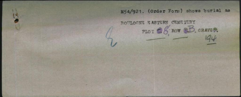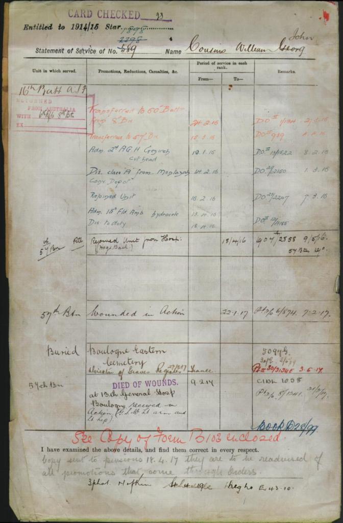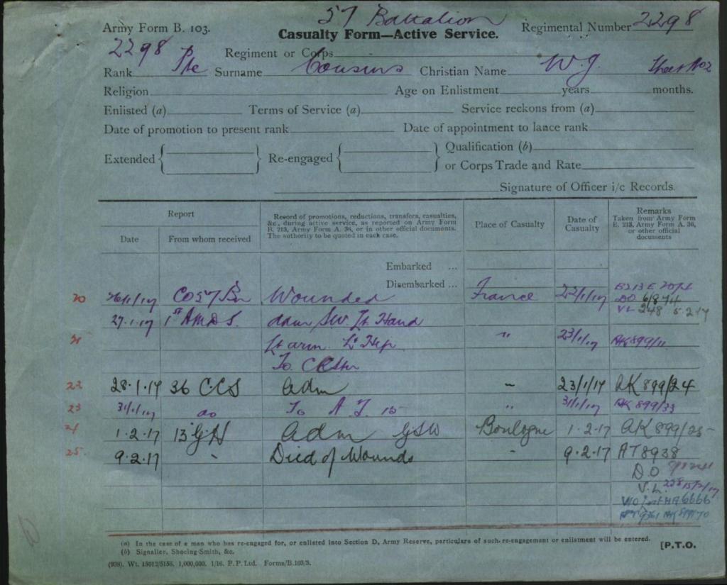 William would serve until he was wounded on the 26th January 1917 in France where he was admitted to hospital for injuries to his hands, being transferred by ambulance train to Boulonge on the 31st January, he would die of his wounds on the 9th February.