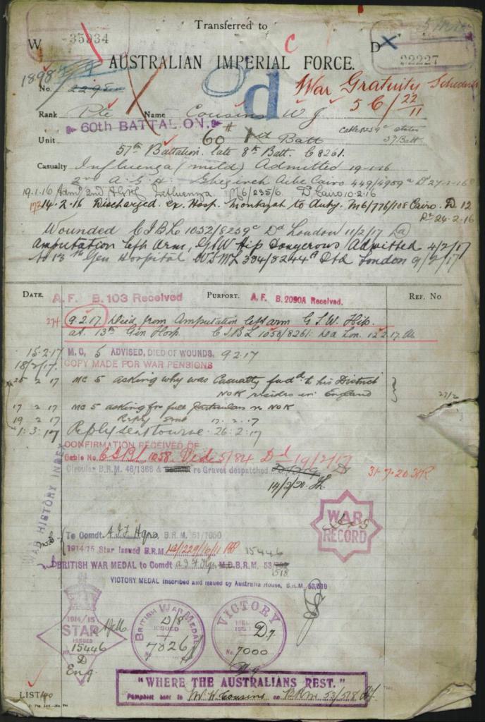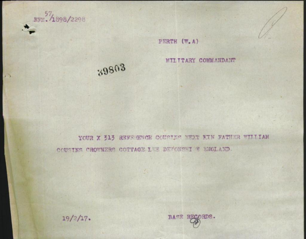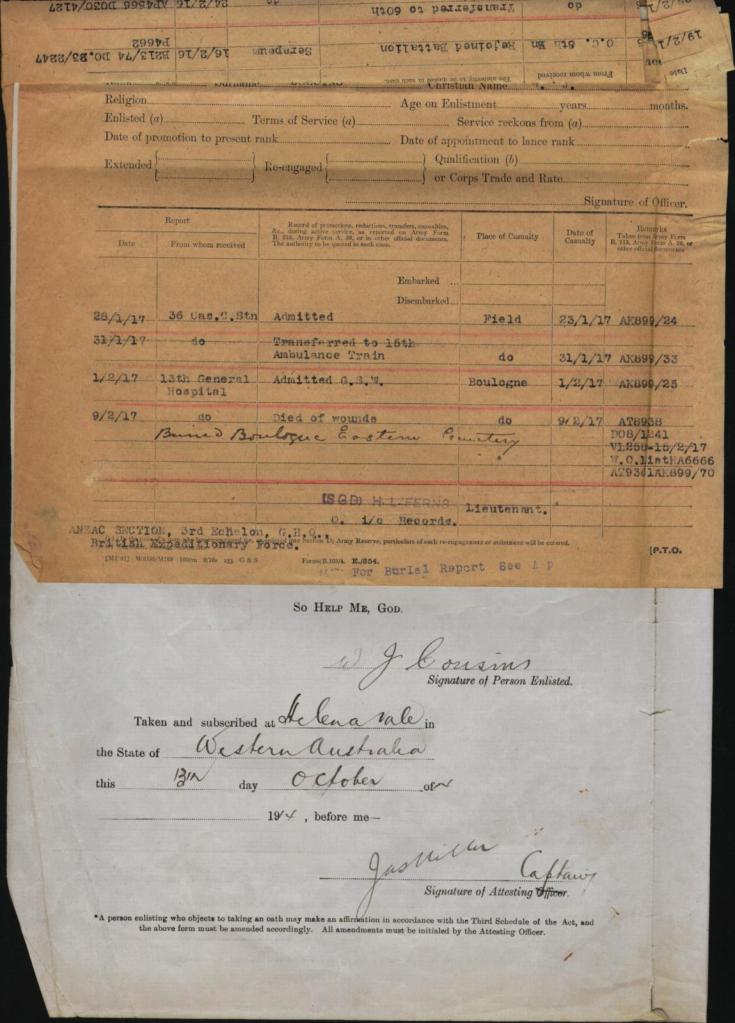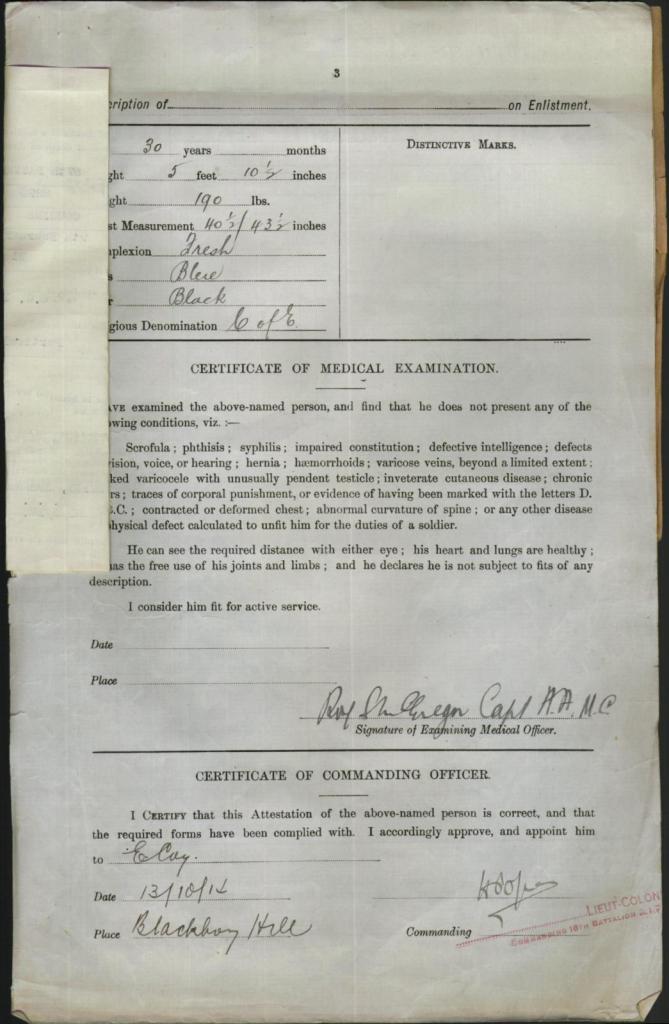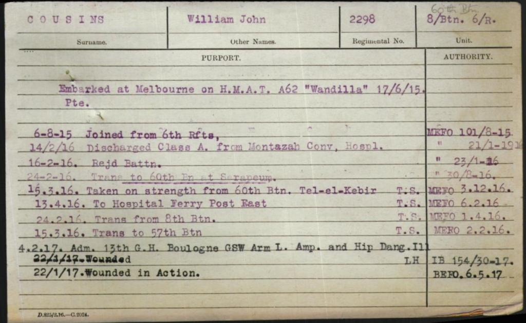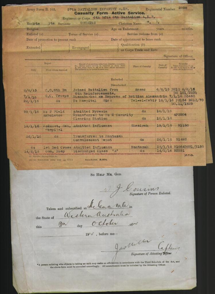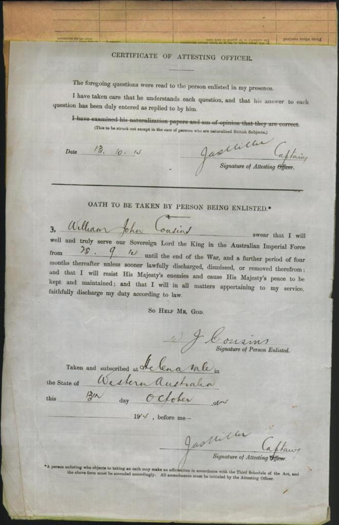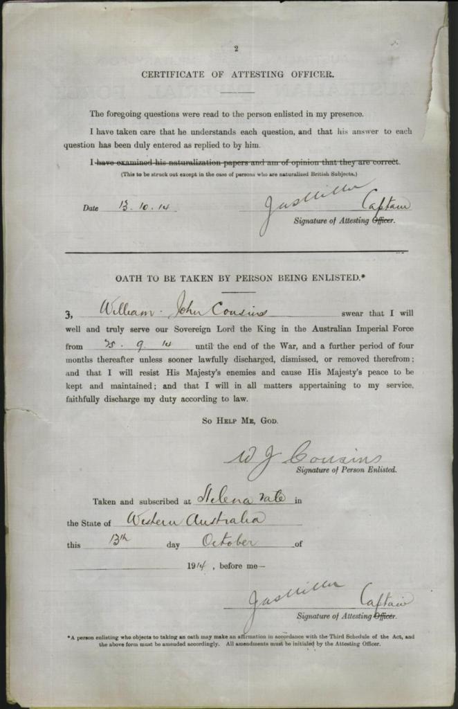 William signed up for service on the 25th September 1914, he was older than most when he signed at 30 years of age initially joining the 57th Battalion of the Australian Infantry, described at the time of his enlistment as being 5ft 10 with a fresh complexion, blue eyes and black hair.