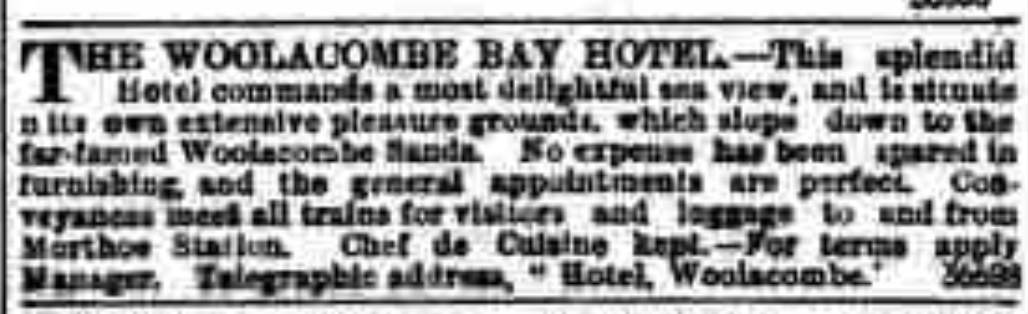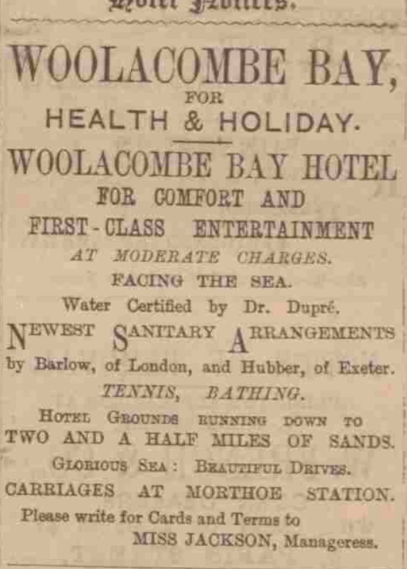 In 1894 one guest of the hotel describes it as a “handsome commodious hotel, run on first-class lines, with water certified by Dr. Blyth, the famous Devonshire analyst, now residing in London; all the latest sanitary arrangements, designed by Barlow, of London, and carried out by Hubber, of Exeter ; and appointments making it a fit home for a prince.”