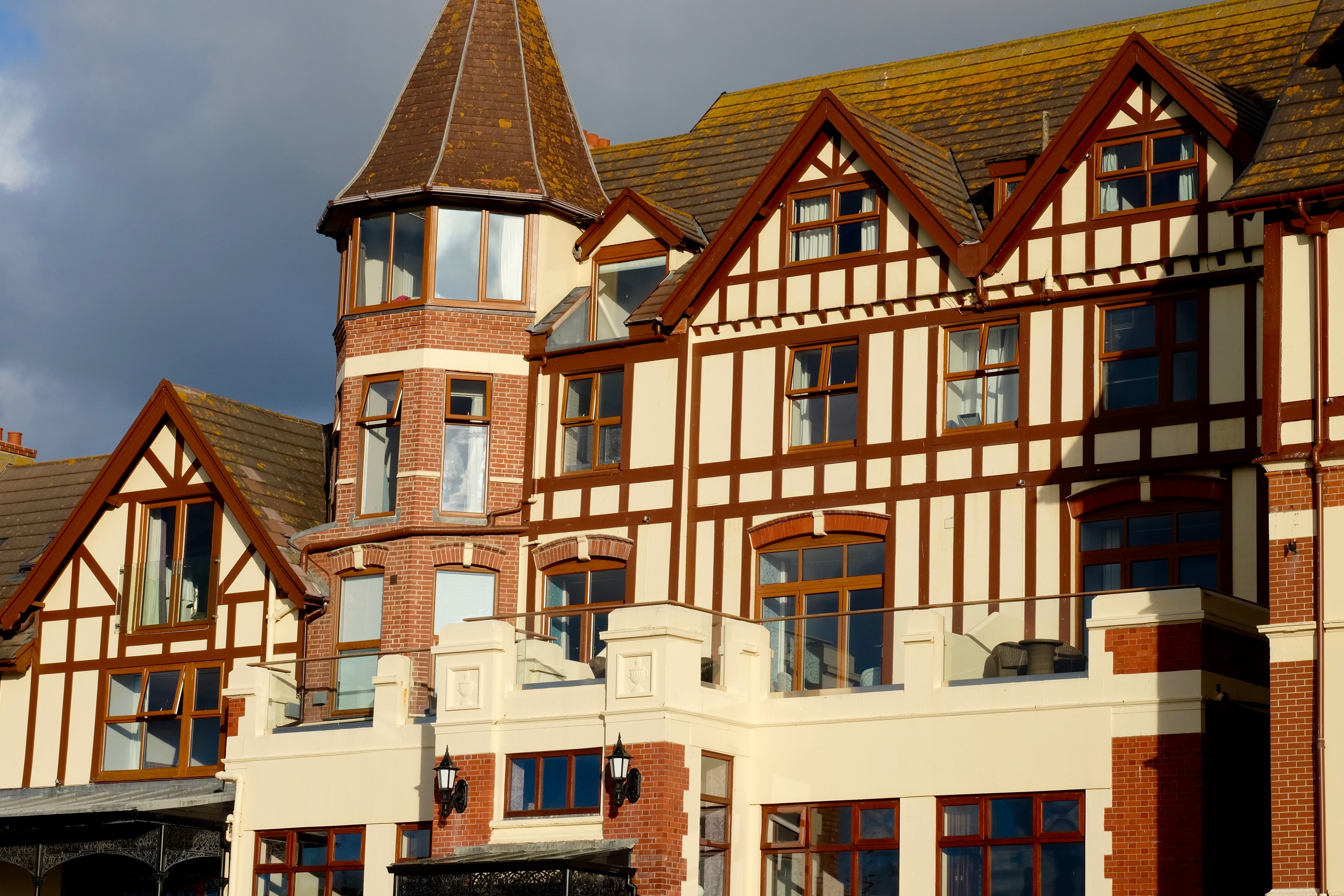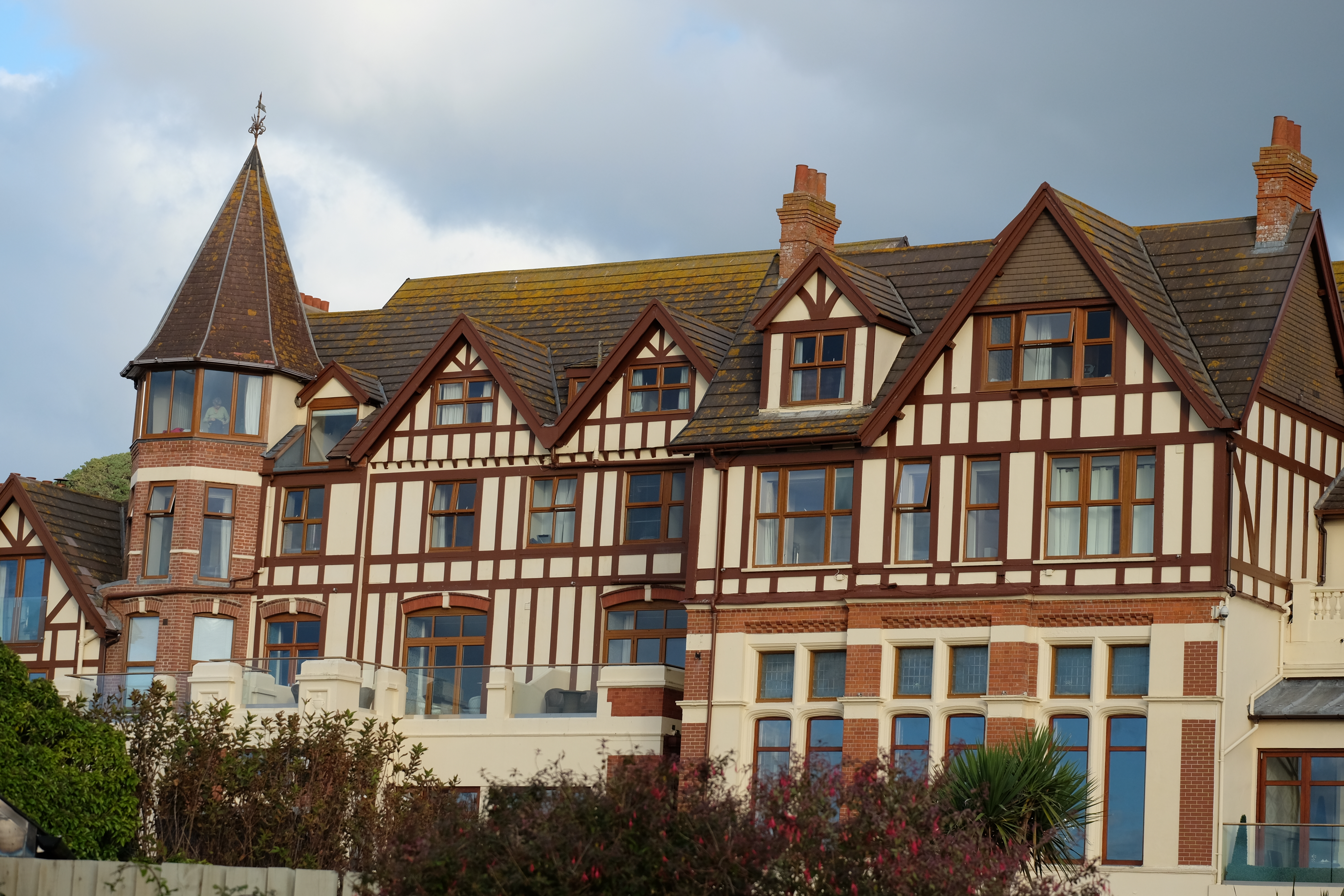 The Woolacombe Bay Hotel was sold to Cheltenham Brewery in 1932, and over the following nine years an extensive programme of renovation transformed the building. The original core of the building is of four storeys, with wings of three storeys. Constructed in a Tudor Revival style, the upper sections have mock timber framing while the lower portions are of exposed red brick. Balconies and bays, alongside a cupola and, on the older portions, chimney stacks add to the character of the building.