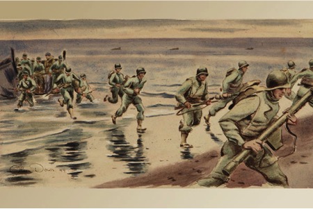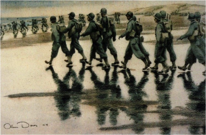 Woolacombe beach was used by the US Assault Training centre, to train soldiers in the art of amphibious assault tactics. All they learned there would be put to use when they were thrown onto the Normandy beaches on D-Day, 6th June 1944. Those training exercises were captured in Olin’s work ‘On the way to the assault boats, ‘LST landing training’ and many others.