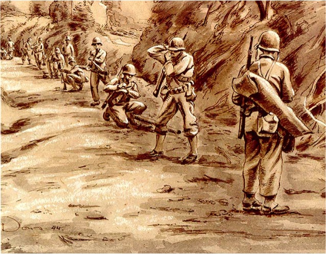 When the Second World War swept across the globe, Olin became a war artist and was one of the few artists commissioned by the American War Department to create drawing impressions of both combat and noncombat in various parts of the world. He would go on to serve in Europe from 1942 until the end of the War in 1945.