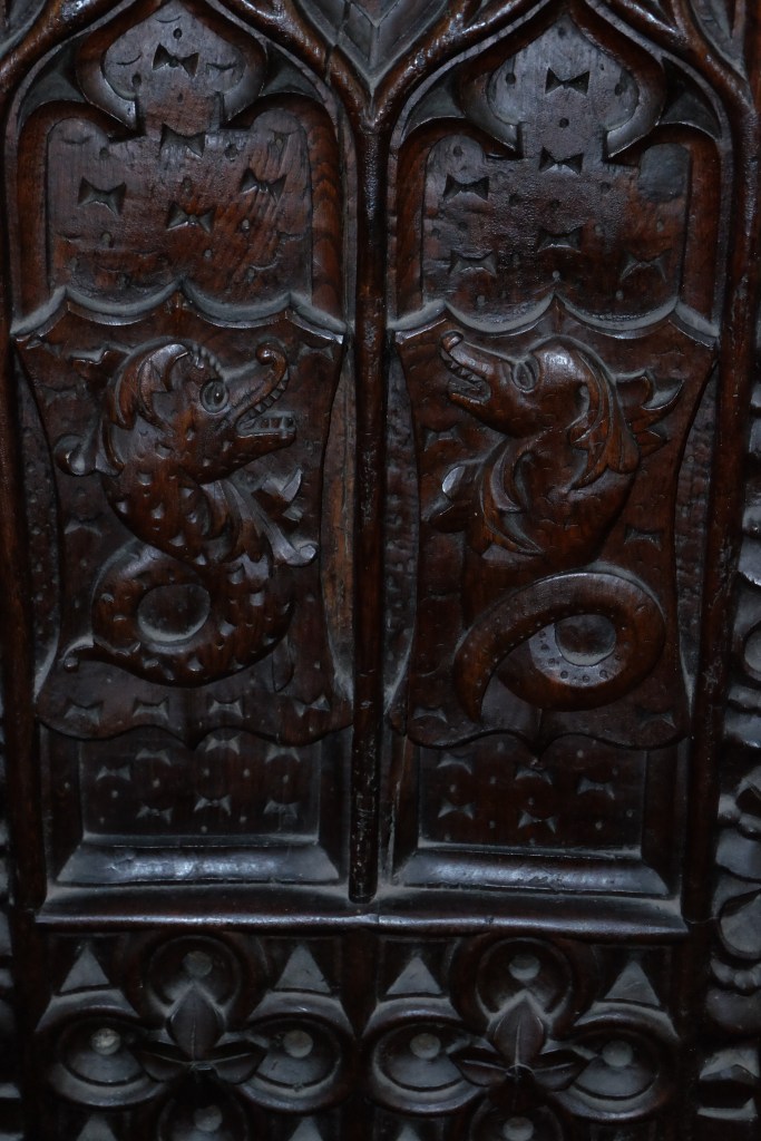 Some of them show traditional religious symbols of the Crucifixion, whilst others have initials and more simple carvings. An interesting article in the North Devon Journal in 1902 examines the use of animal carvings in churches, in particular those in St Mary’s, Mortehoe: “Then let us mention the carving of an animal, which has given rise to more contention, most probably than that of any other such subject in any church. We refer to the sculpture known as the ‘kangaroo in the church at Morte-Hoe. This country church has become noted for this quaint carving. It adorns the end of one of a series of pews. Fishes abound on some of those pew end carvings, but there is only one ‘kangaroo’. To us today the strange animal appears much more like and old drawing of the “leviathan” of Job or like a sea serpent than a kangaroo! But local tradition will persist in the belief that the sculptor, whoever he was, in his own time meant this for a picture of what animal; therefore it is always called ‘kangaroo’