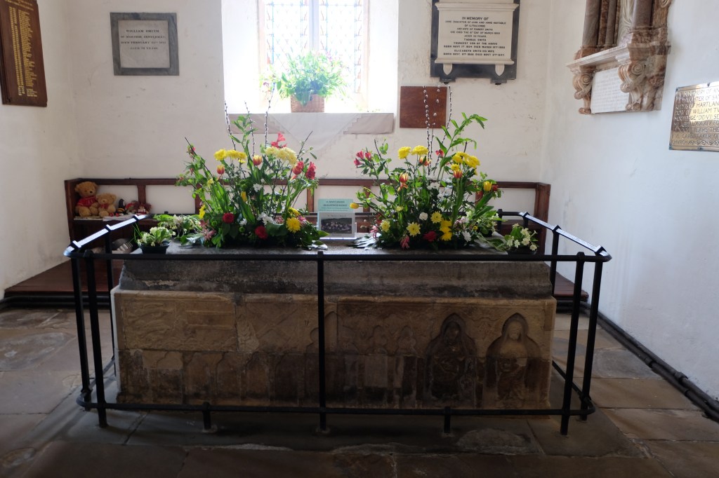 The tomb has a thick slab on the top of the vault, surrounded by Saxon letters, and a full length body of ‘De Tracy’ engraved on the top showing the figure in robes and holding a chalice in his hands. Around the vault are sculptures, showing nuns, the crucification and a coat of arms.