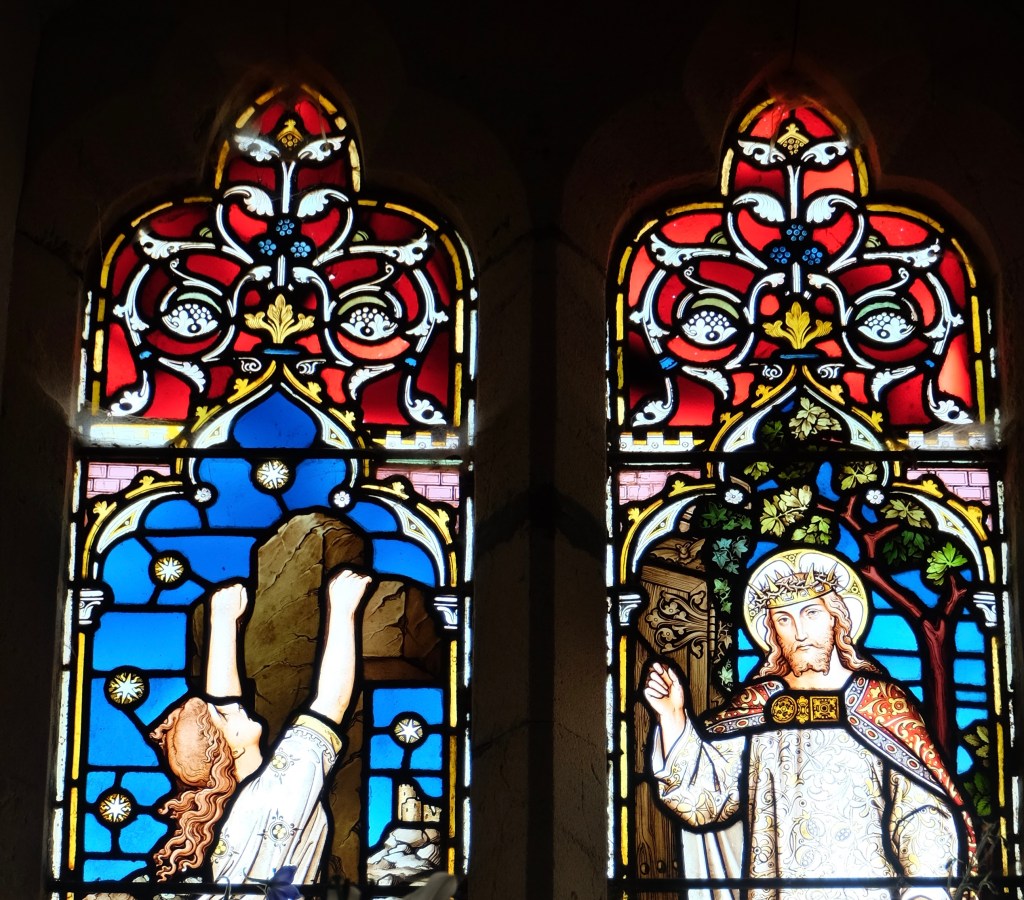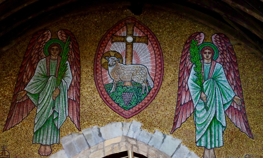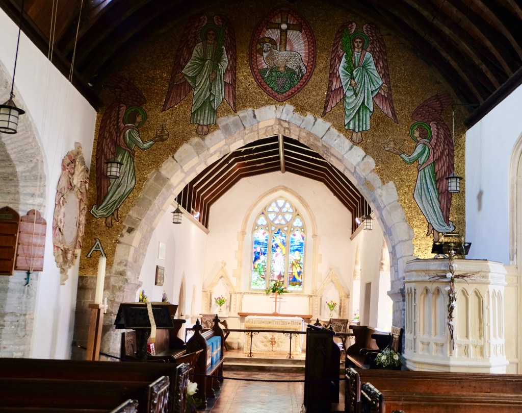 A splendid mosaic has been erected over the chancel arch as a memorial to the late Mrs Longstaff who was such a good patroness of the Church and did much for its adornment. The mosaic which is much admired for its simplicity and dignified beauty, was designed by Mr. Selwyn Image and carried out by Messers. Powell of London. It represents the Lamb of God, with figures of angels offering crown and orb, and holding emblems of blessing and peace. The artwork showing Images plans for the arch can be seen at the William Morris Gallery, who he had a long connection with the arts and crafts movement and a particular friendship to the well known William Morris. Selwyn’s connection to Mortehoe was bought about by his friendship to the Longstaff family who lived at Twitchen House, where another of Selwyns stained glass windows can be seen.
