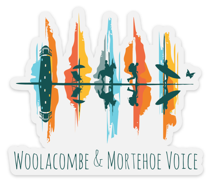 The Woolacombe & Mortehoe Voice logo represents some of the things we love about the area. This is a clear car sticker perfect for your car or van.